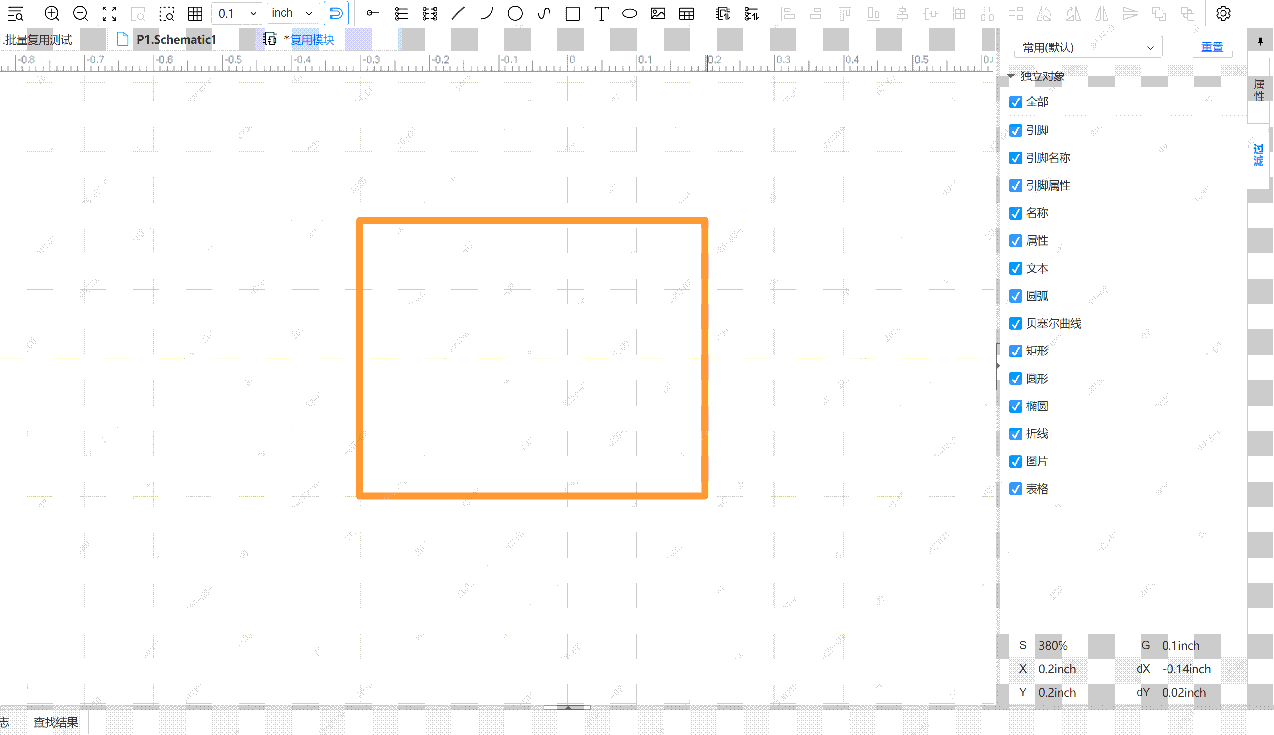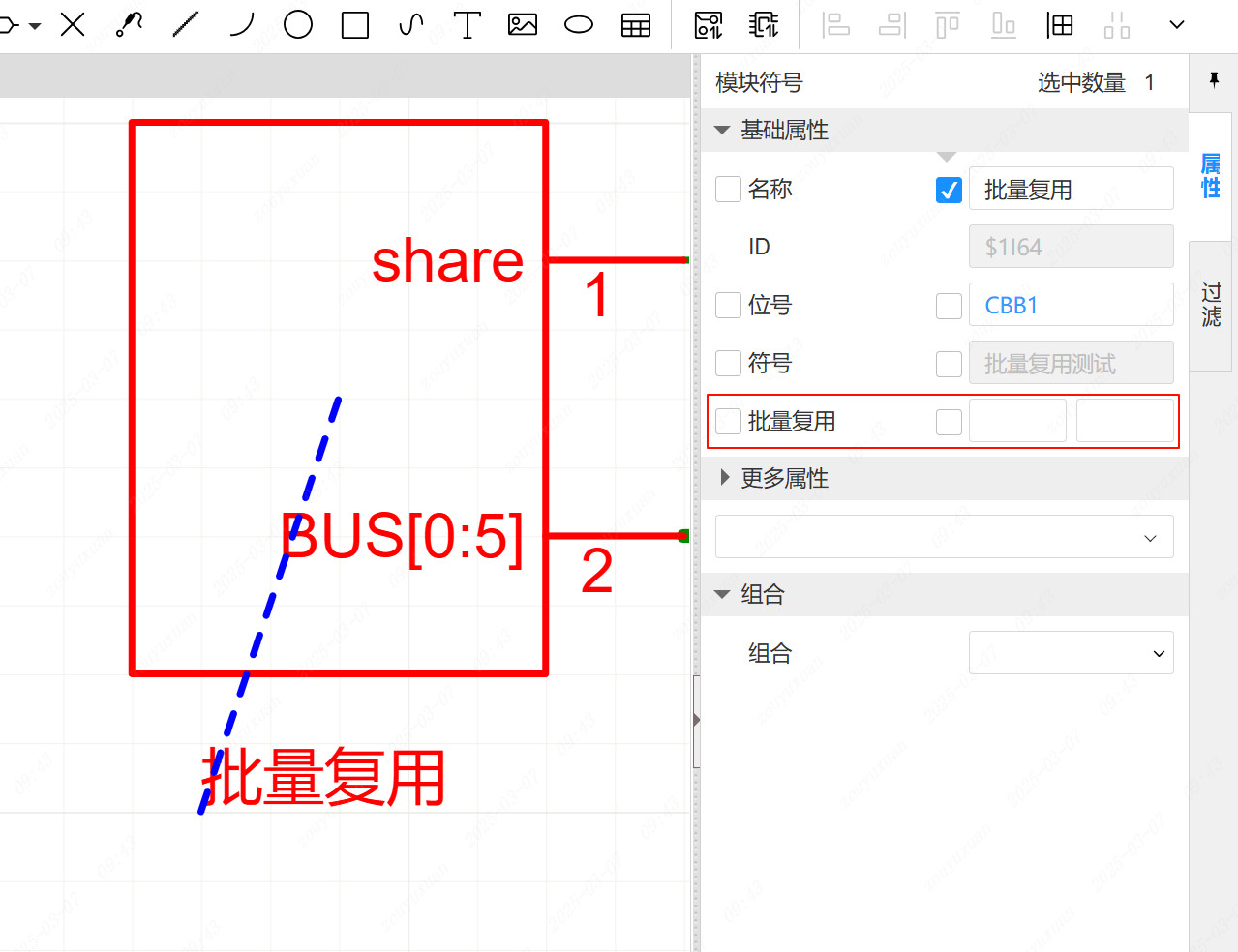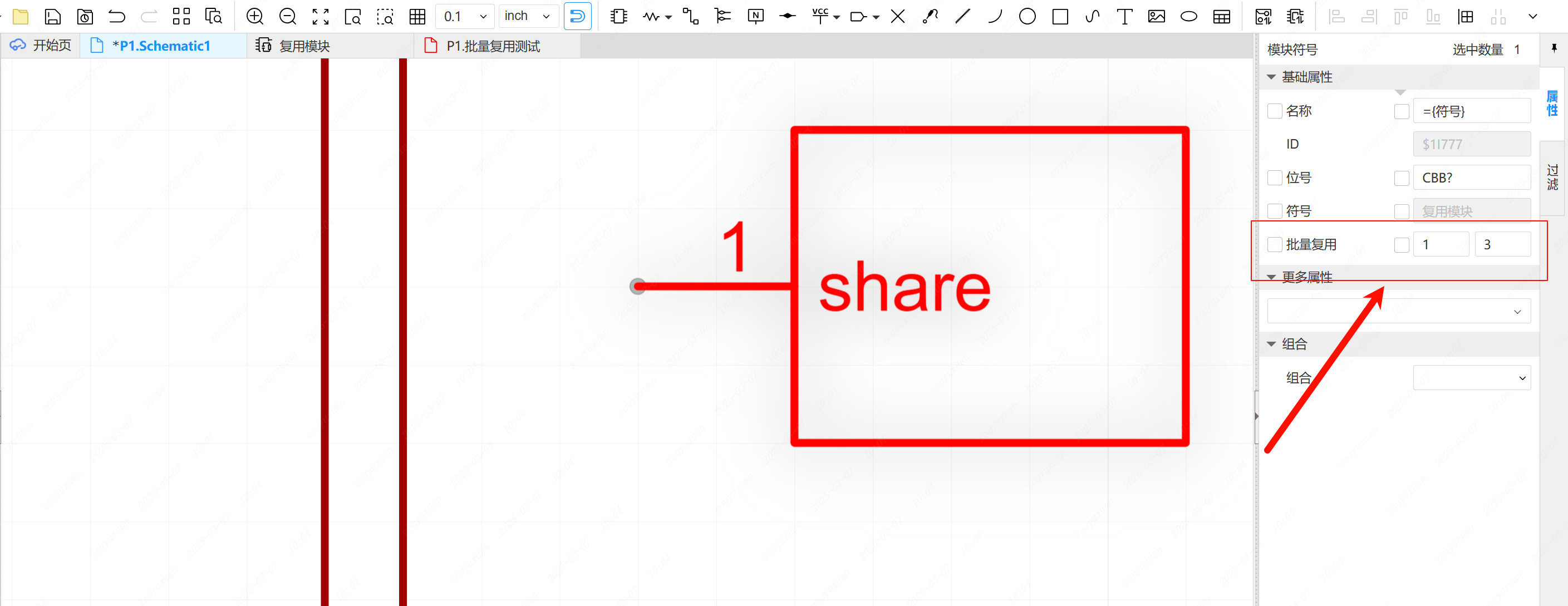 在原理图中,单击复用模块后,右侧属性栏将显示批量复用选项。