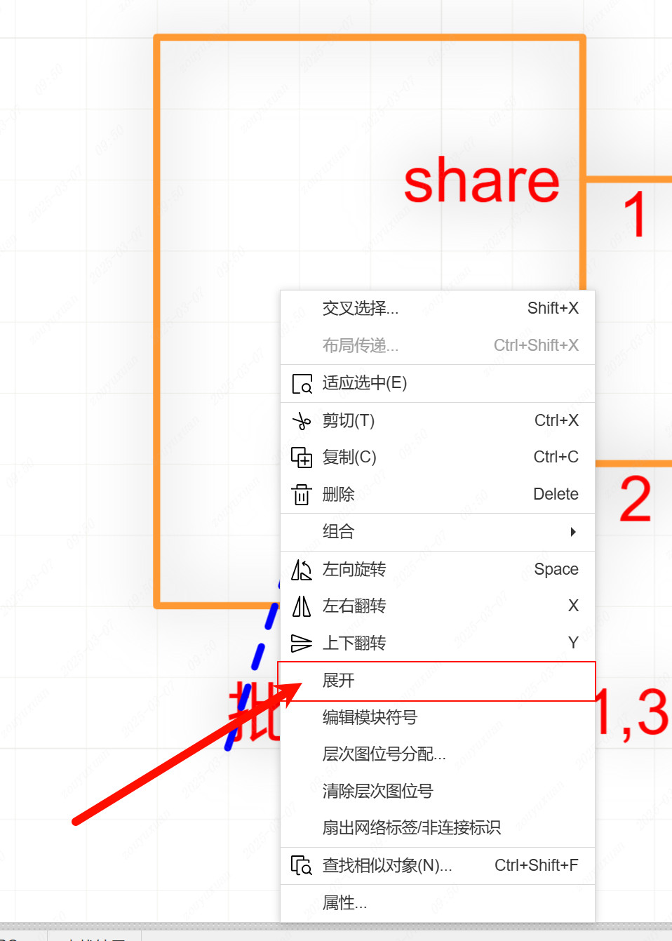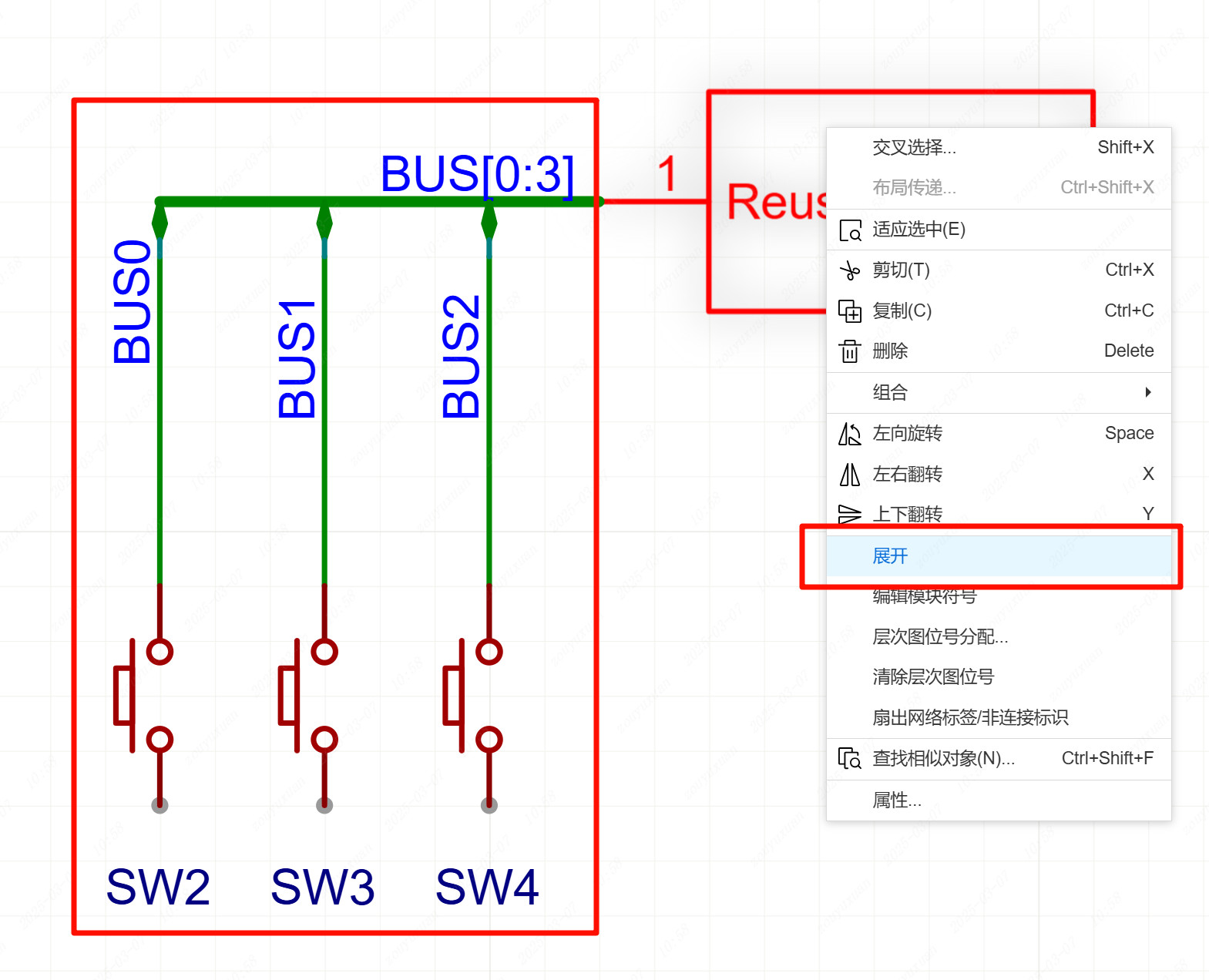 在原理图中,右键单击复用模块并选择 展开 选项,以打开复用模块的子原理图。