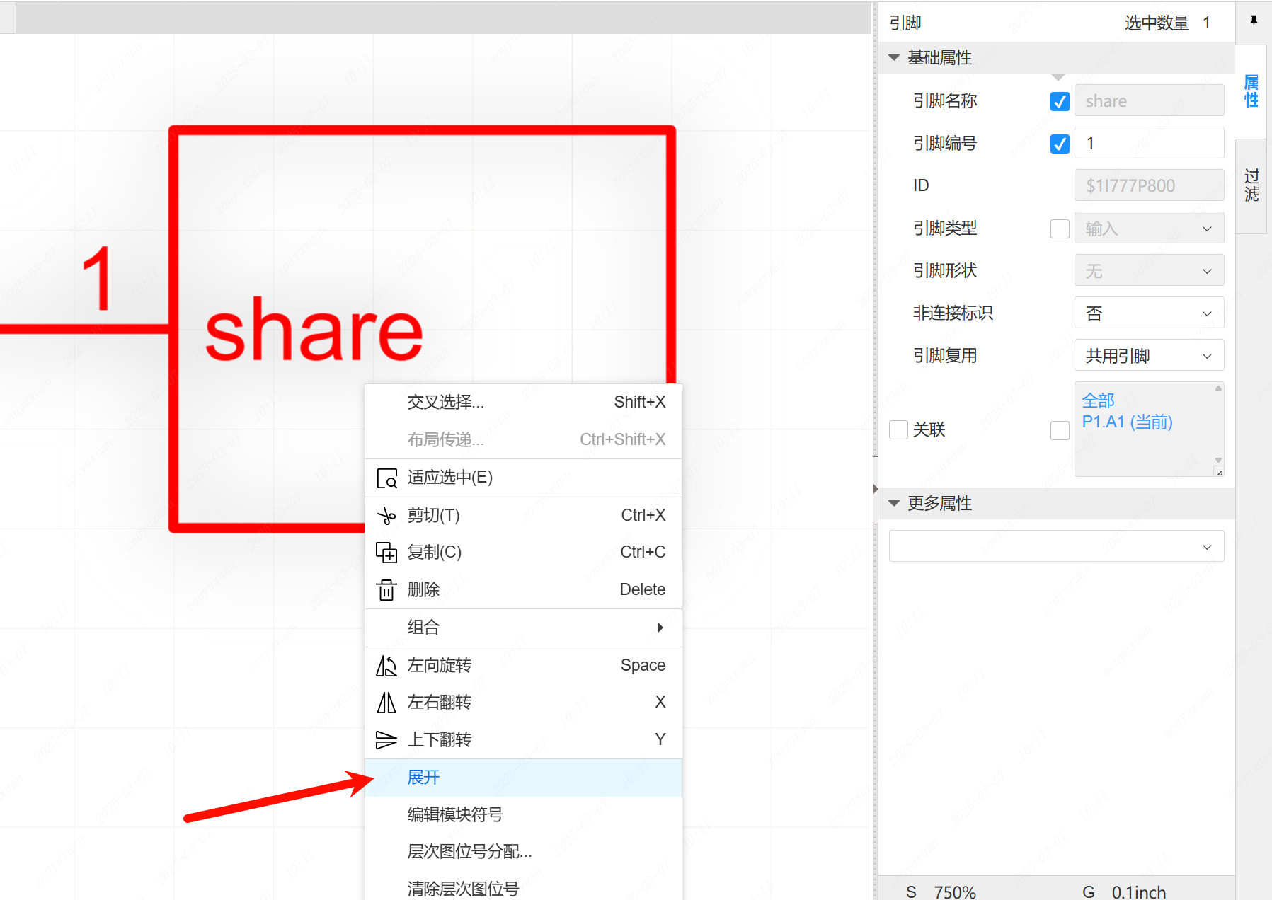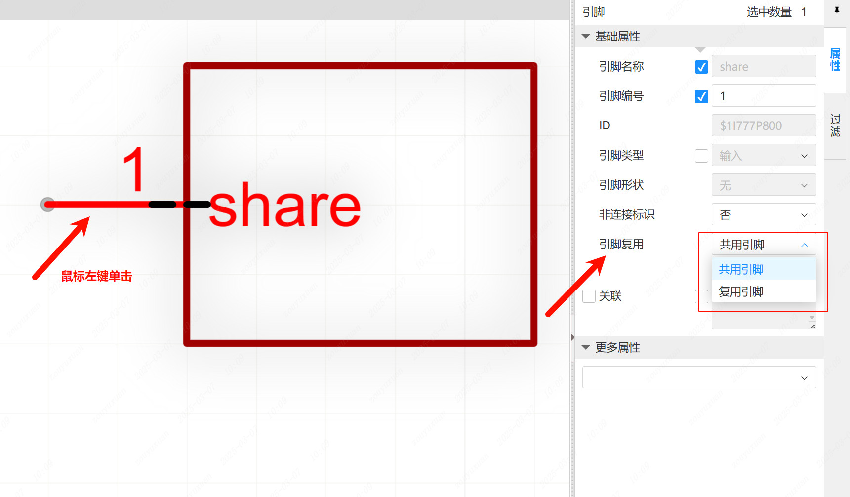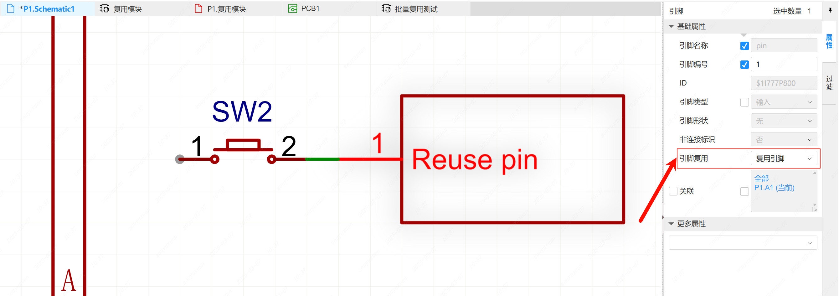 开启批量复用功能后,单击复用模块的引脚。此时,在右侧属性栏中会出现引脚复用属性,支持下拉切换共用引脚和复用引脚。