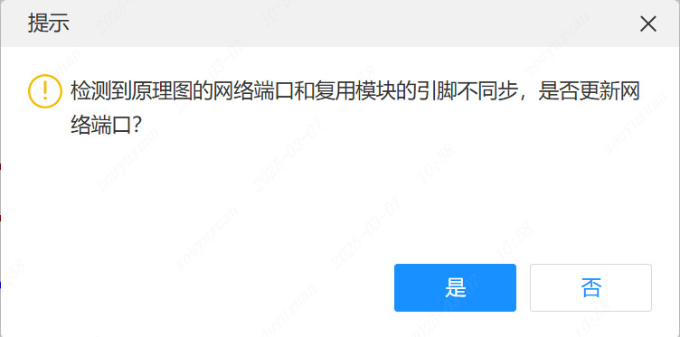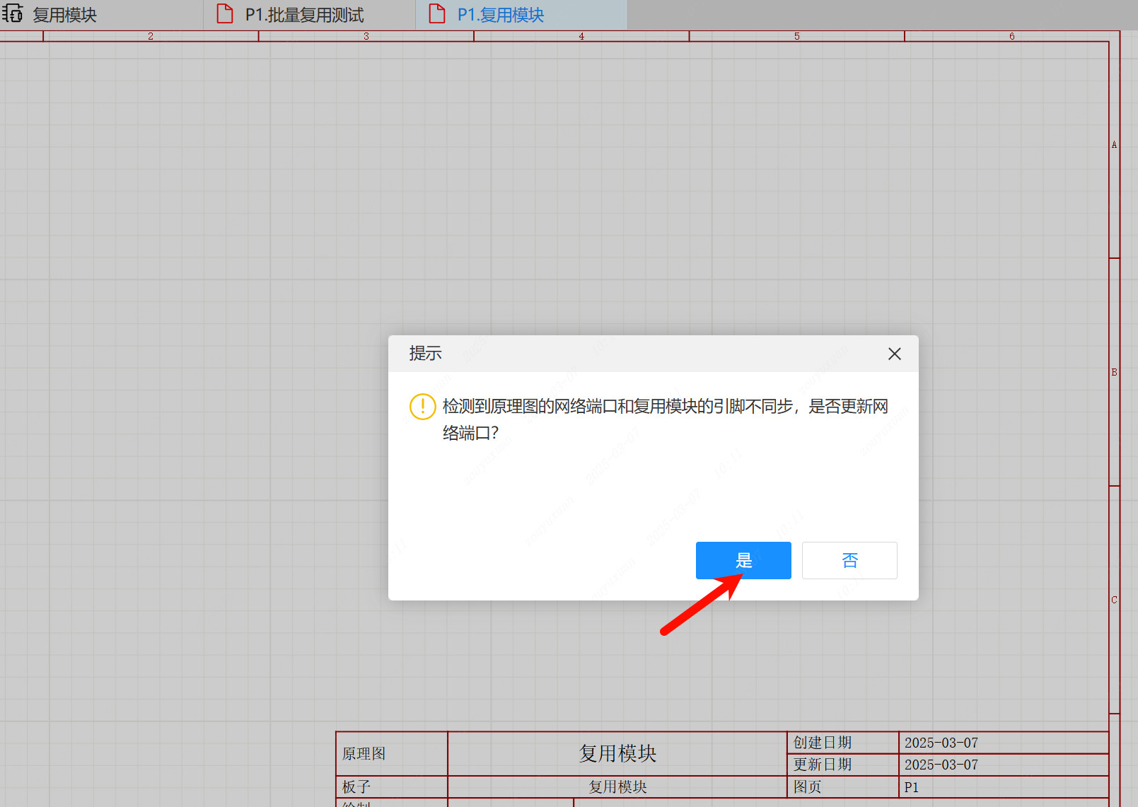 进入复用模块子原理图时,系统会弹出确认窗口,选择是以同步更新网络端口。