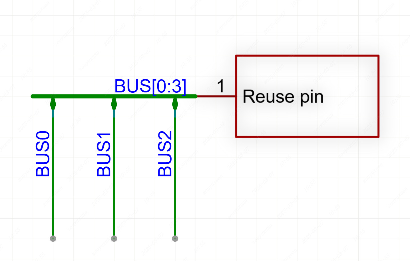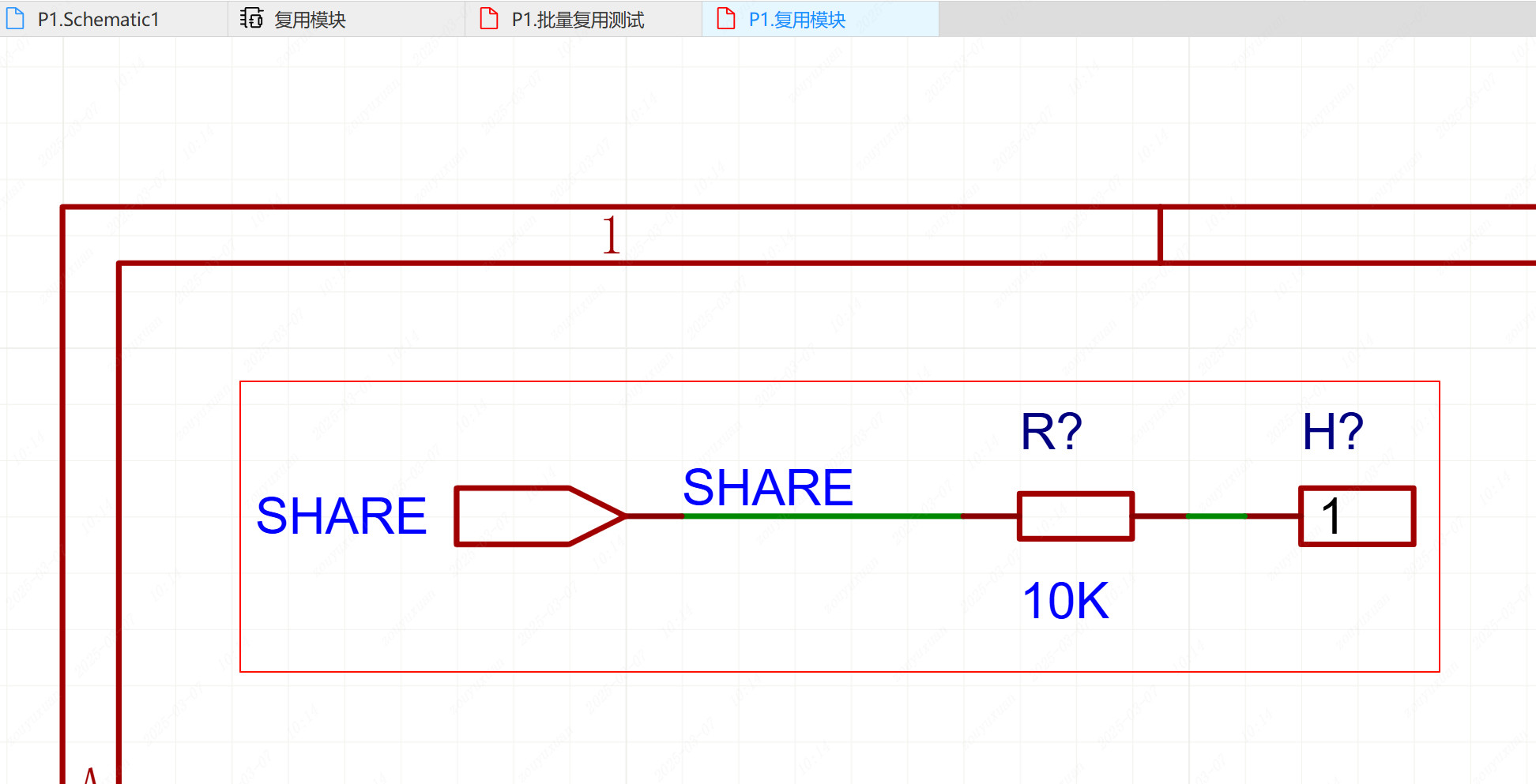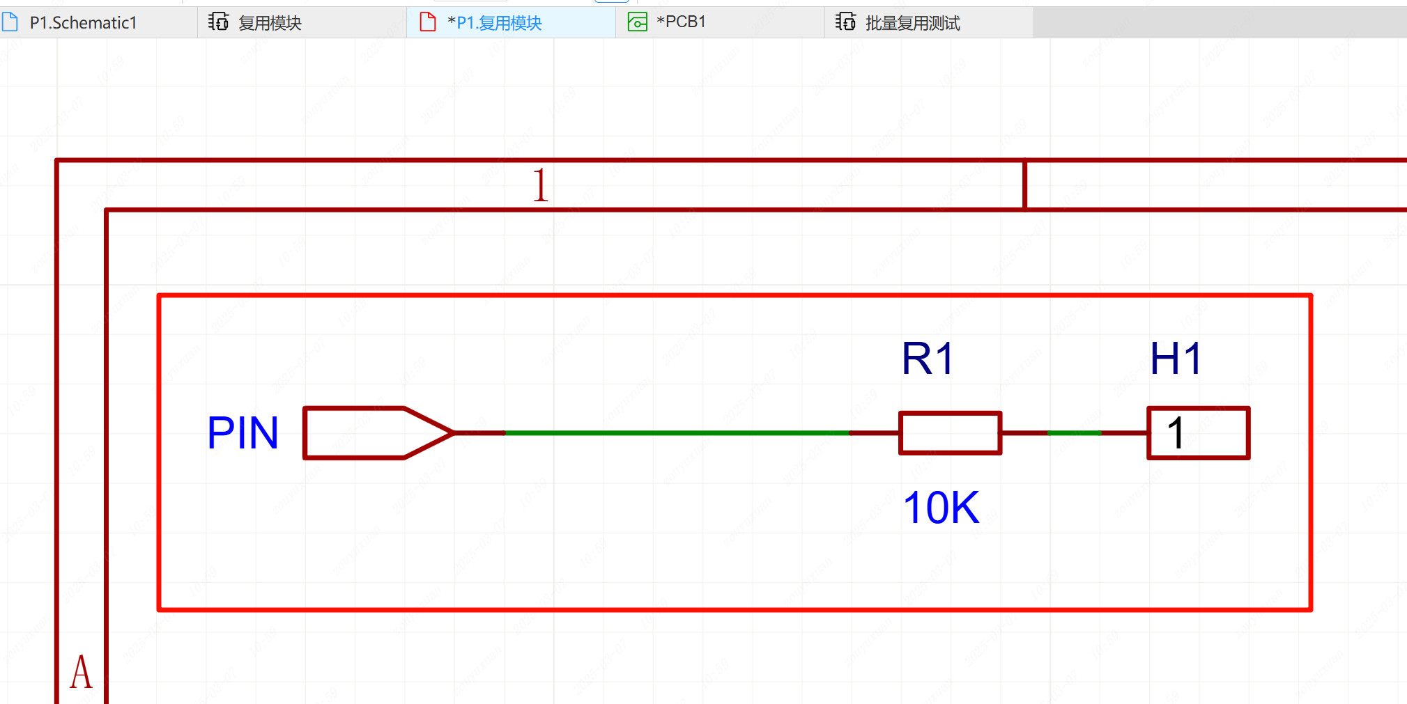 引脚共用功能允许在对复用模块进行批量复用时,使多个模块图页的相应引脚共享同一个外部连接,复用模块之间为短接关系。