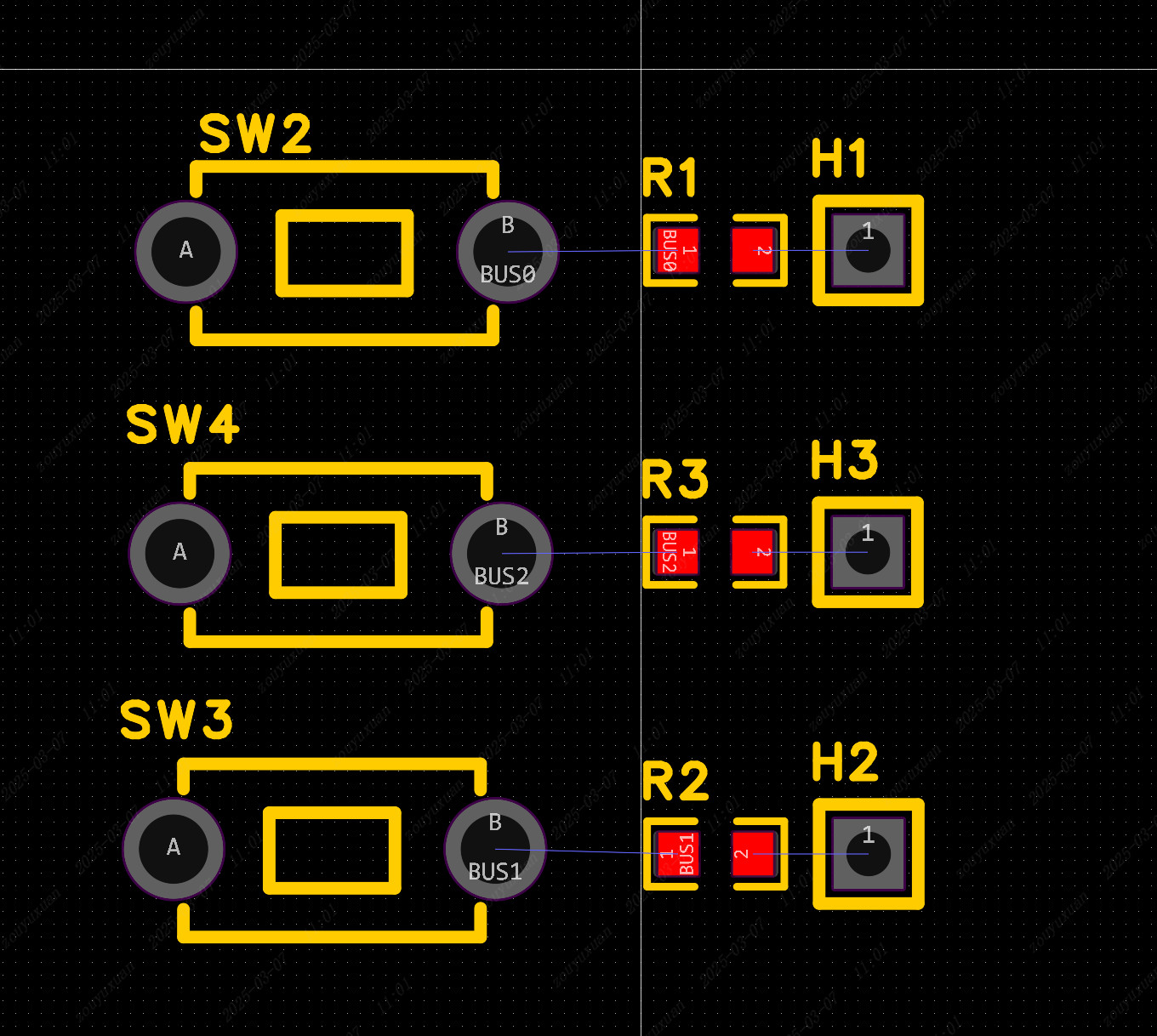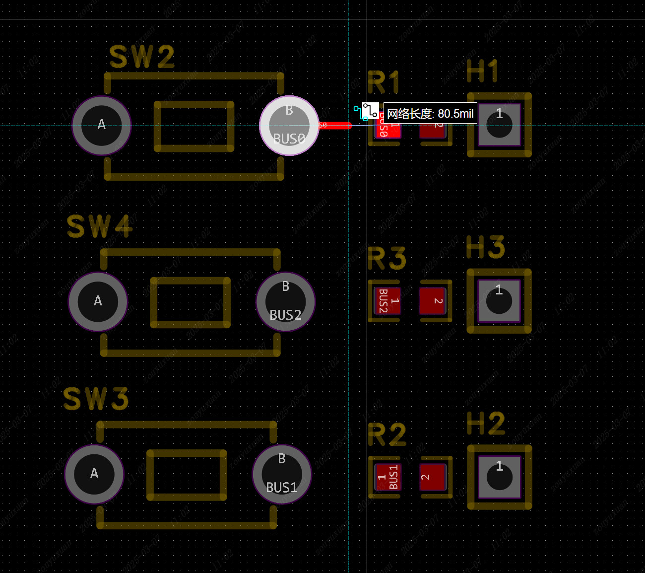 可以观察到,复用模块被批量复用了三次,并且复用模块之间为短接关系,通过共用引脚连接到了同一个开关上。