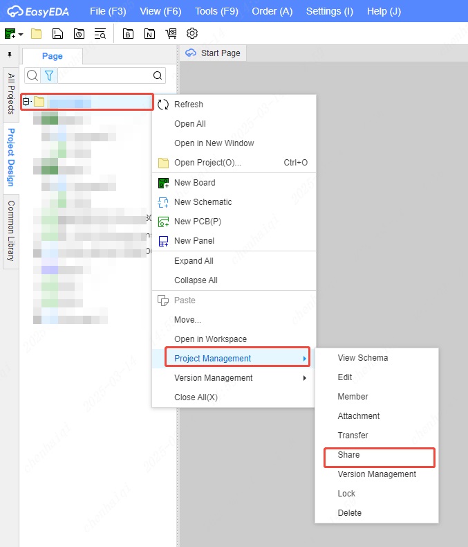 Select the folder in the Engineering section on the left and then click the right mouse button to select Share. Note: Sharing to oshwlab means that you make your project public and anyone can download and use your project, if you don't want that please don't share it. (Our oshwlab platform has protection for designers' rights: any project shared to oshwlab by individual users is not allowed to be commercialised, once found, the original authors have the option to protect themselves by legal means.)