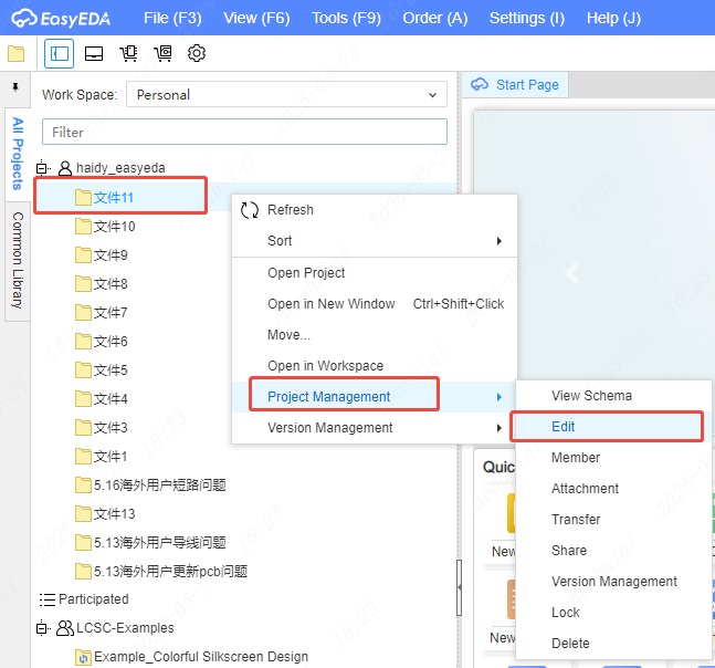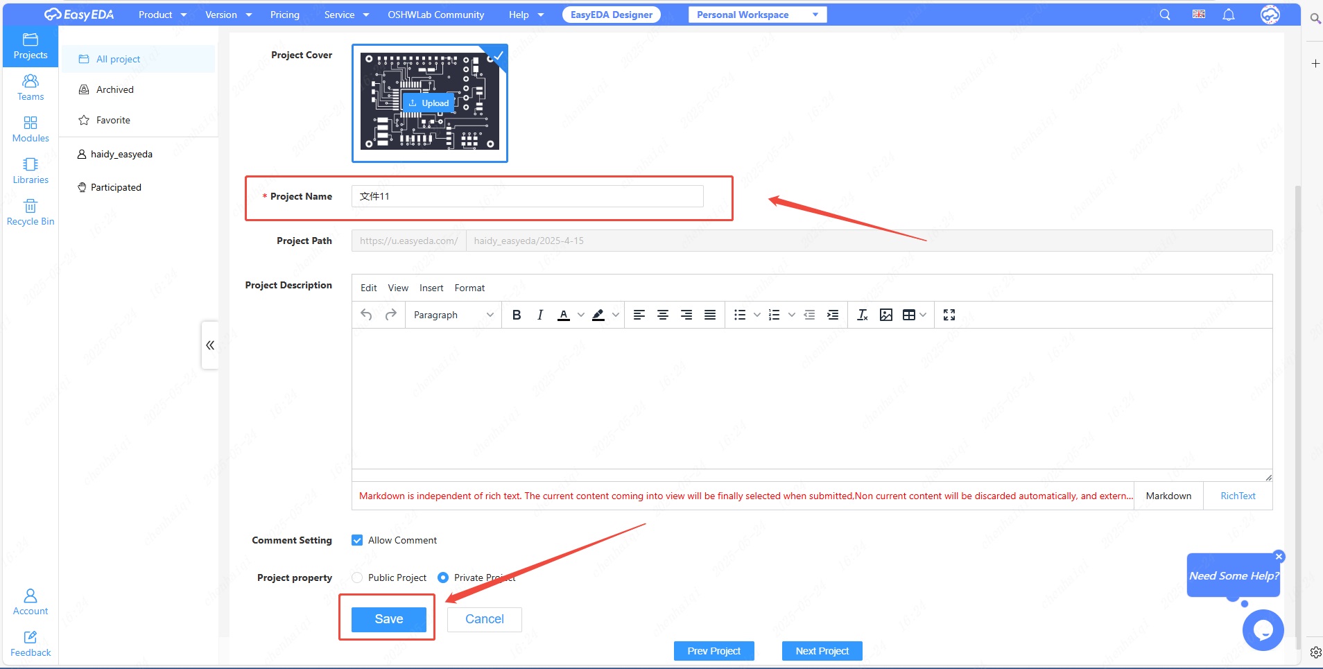 It may be because the file from oshwlab open project, not the user's personal, needs to save as,save in the local computer and then imported into eda to save.
