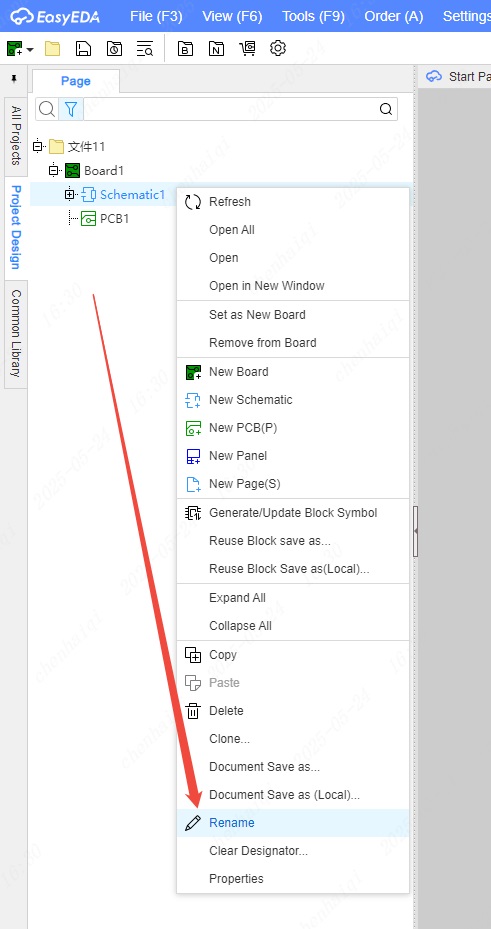Select the schematic or PCB in the project column on the right, right-click and find the "Rename" tool to modify it.
